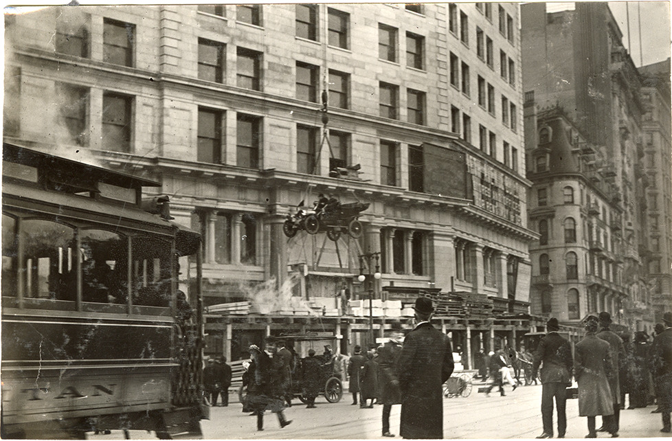 View of a 30 horsepower Kissel Kar runabout being hoisted to the upper levels of the new Fifth Avenue Building in New York, as part of a publicity stunt. Onlookers in foreground; streetcar is partially visible on left. Stamped on back: "Spooner & Wells, Inc., photographers, telephones 3472-3473 Columbus, 1931 Broadway, New York."