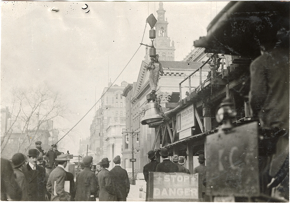 View of a worker on hoist with bell for the Metropolitan Life Tower in New York. A 30 horsepower Kissel Kar runabout was initially driven to this location as part of a publicity stunt, for the purpose of hoisting it to the top. Officials of the Metropolitan, however, halted the stunt just before it could take place. The car was later hoisted to the top of the new Fifth Avenue Building. Onlookers and a "Stop, danger" sign in foreground.