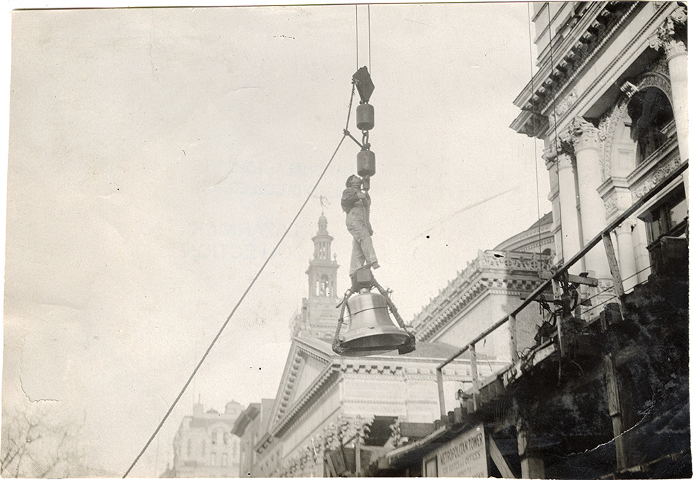 View of a worker on hoist with bell for the Metropolitan Life Tower in New York. A 30 horsepower Kissel Kar runabout was initially driven to this location as part of a publicity stunt, for the purpose of hoisting it to the top. Officials of the Metropolitan, however, halted the stunt just before it could take place. The car was later hoisted to the top of the new Fifth Avenue Building.