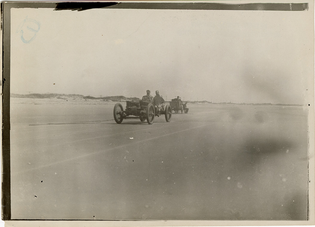 View of driver and passenger racing 12 cylinder Maxwell car during the elimination race at the 1906 Vanderbilt Cup races, Atlantic City, New Jersey. Unidentified car in background. Handwritten on back: "The Maxwell 12 cyl. for Vanderbilt Cup elimination race, 1906, at Atlantic City."