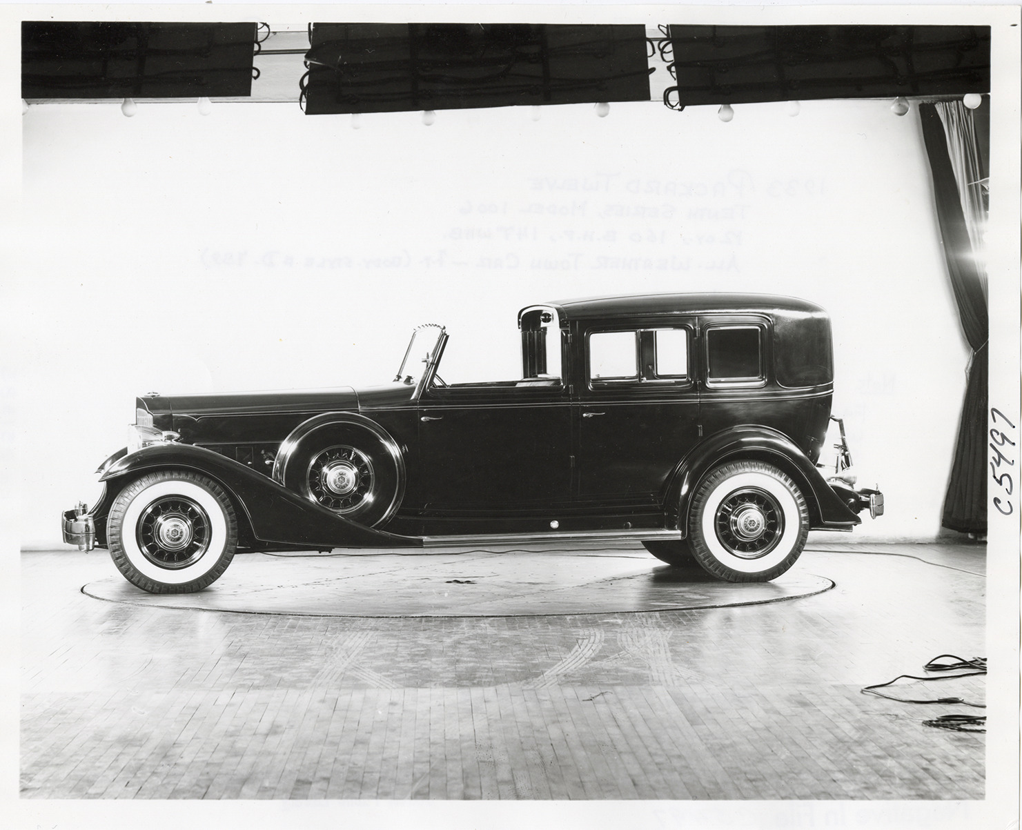 View of 1933 Packard Twelve car, Tenth Series, Model 1006. Handwritten on back: "1933 Packard Twelve, Tenth Series, Model 1006, 12 cy., 160 b.h.p., 147" whb. All weather town car, 7-p. (Body style #D-759. By: LeBaron. Note: factory photo, left side, wood wheels. Side wheel carrier with metal covers."