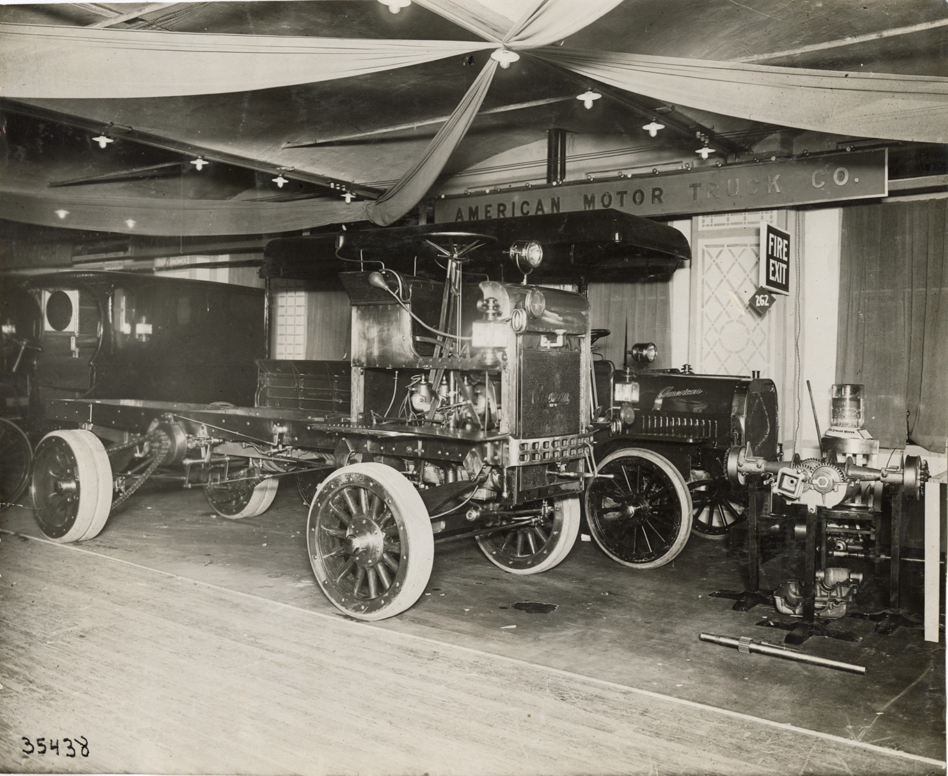 View of 1910 American trucks on display at trade show. Sign displayed in background reads: "American Motor Truck Co." Stamped on back: "Spooner & Wells, Inc., photographers, telephones 3472-3473 Columbus, 1931 Broadway, New York." Handwritten on back: "Motor trucks--American (Lockport, N.Y.), 1910."