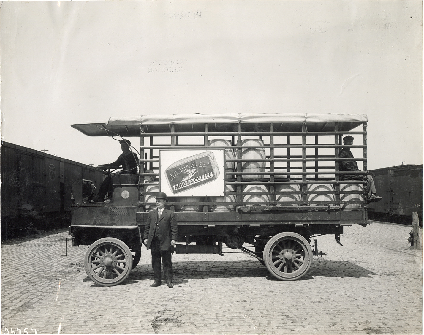 View of driver and two men posing in a 1910 American truck owned by the Central Brewing Company. Barrels are stacked in truck. "The Central Brewing Company, 68th St. & East River" painted on side of truck. Stamped on back: "Spooner & Wells, Inc., photographers, telephones 3472-3473 Columbus, 1931 Broadway, New York." Handwritten on back: "Motor trucks--American (Lockport, N.Y.), 1910."