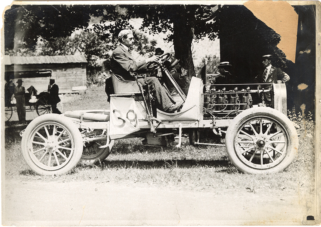 View of driver posing in Rambler car no. 39. Stamped on back: "Spooner & Wells, Inc., photographers, telephones 3472-3473 Columbus, 1931 Broadway, New York. Sent on approval, need not be purchased unless wanted. Will be credited when returned promptly. Spooner & Wells, Inc. 1931 Broadway, New York. Telephone 3472-3473 Columbus. Jul 1 1908." Handwritten on back: "Rambler winner of several events."