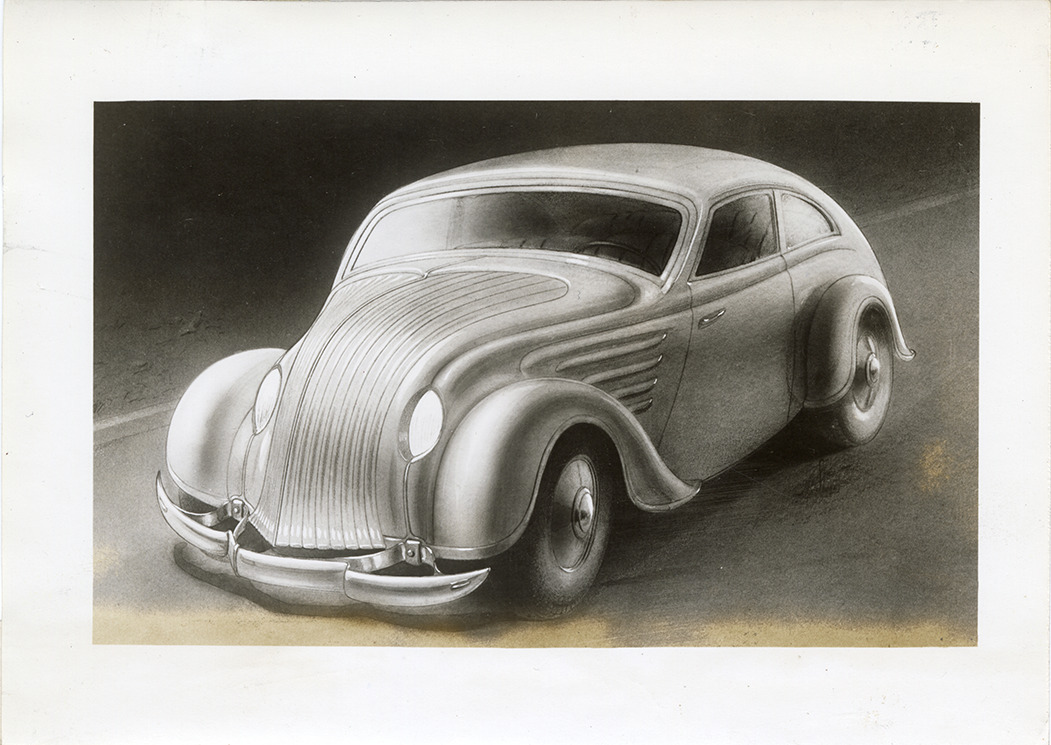 Artist's depiction of a streamlined car. Label on back: "This design is typical of the scientific streamlining which aero-dynamic engineers have been urging upon the automobile industry. While its adoption would mean the entire abandonment of the conventional chassis and the scrapping of millions of dollars of old manufacturing equipment, engineers contend that it would soon repay the entire cost in increased efficiency. They declare that the rounded nose and widened front is even more essential for aero-dynamic efficiency that the sloping rear lines. Institute of Aero-Dynamic Research, New York."