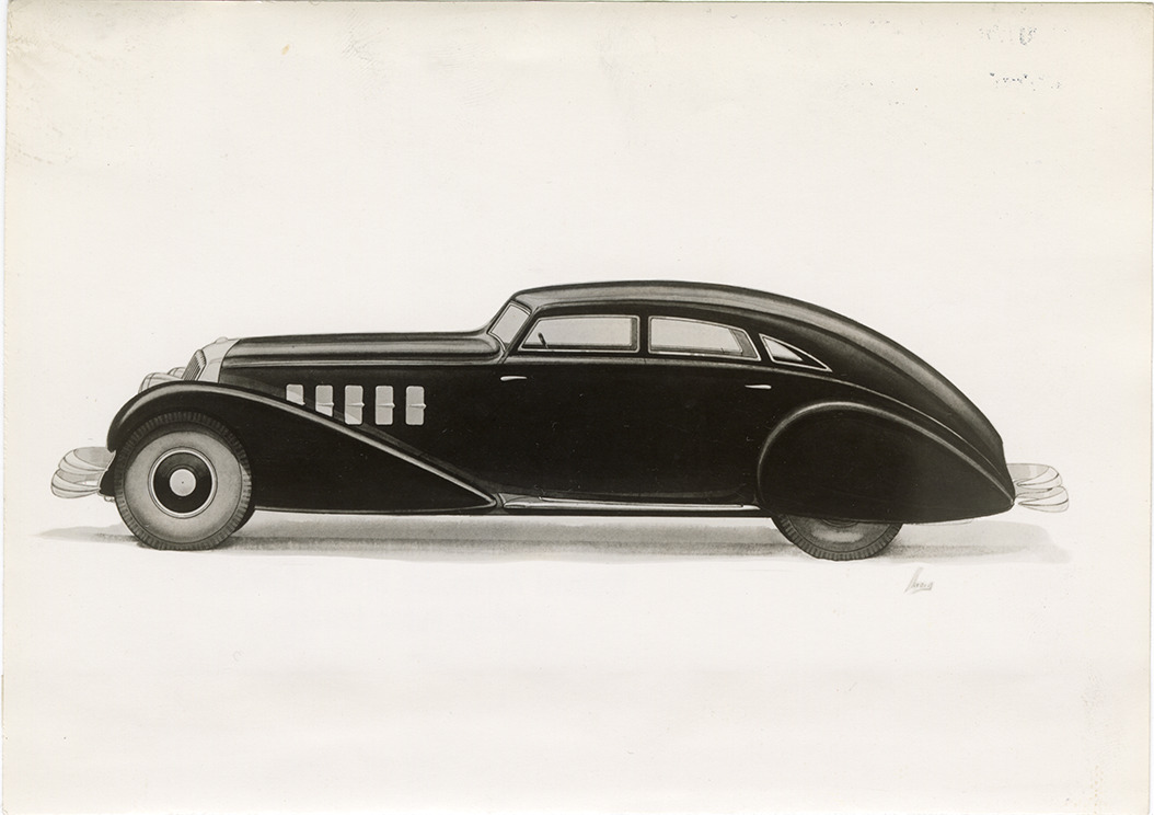 Artist's depiction of a streamlined car. Label on back: "This design is typical of almost all of the current approaches to streamlining. The advantage of the design, from the manufacturer's viewpoint, is that no essential alteration of the conventional chassis is involved here, and scrapping of large volumes of equipment is avoided. The front end is not greatly modified; the main emphasis is on remodelling of the rear, with new type fenders. Institute of Aero-Dynamic Research, New York."