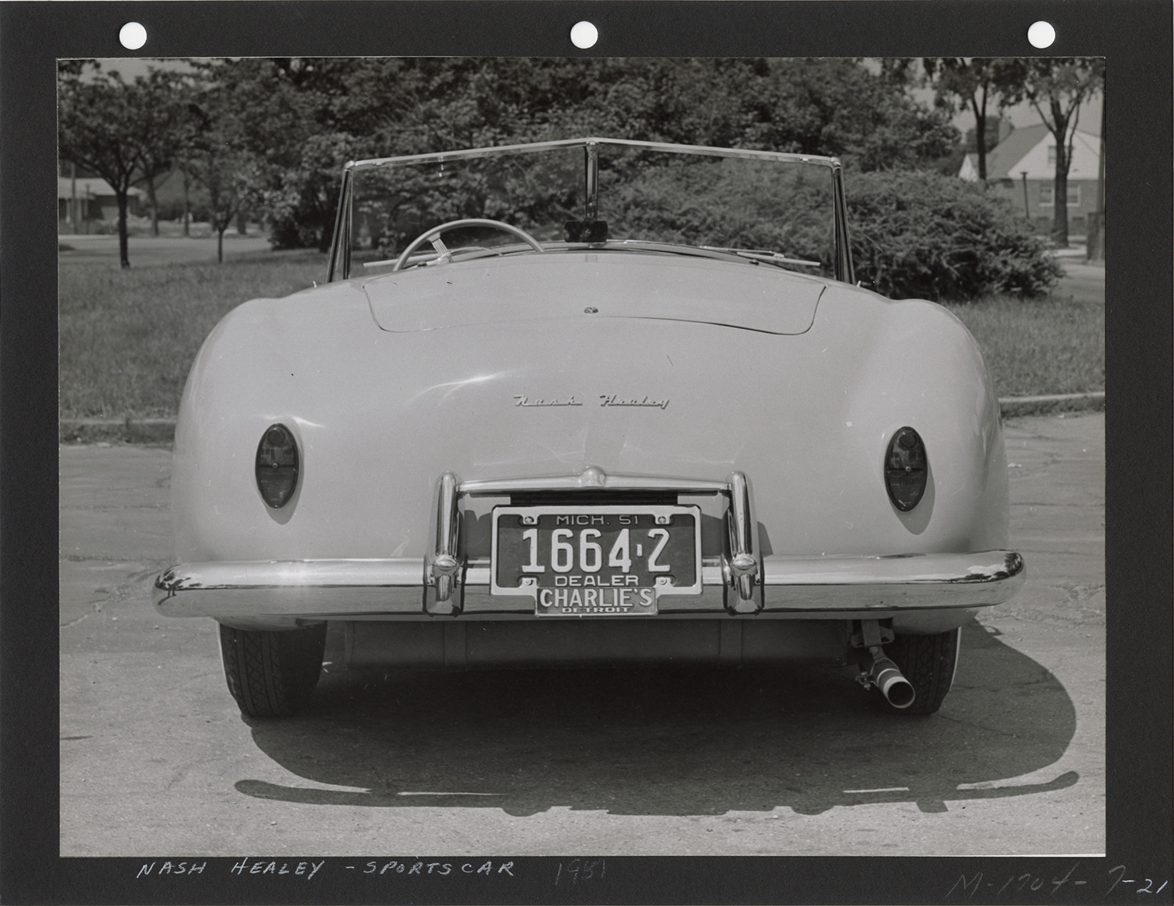 Rear view of 1951 Nash Healey convertible. Michigan license plate with "Charlie's Detroit" frame. Printed on front: "Nash Healey, sports car, 1951. M-1704-7-21."
