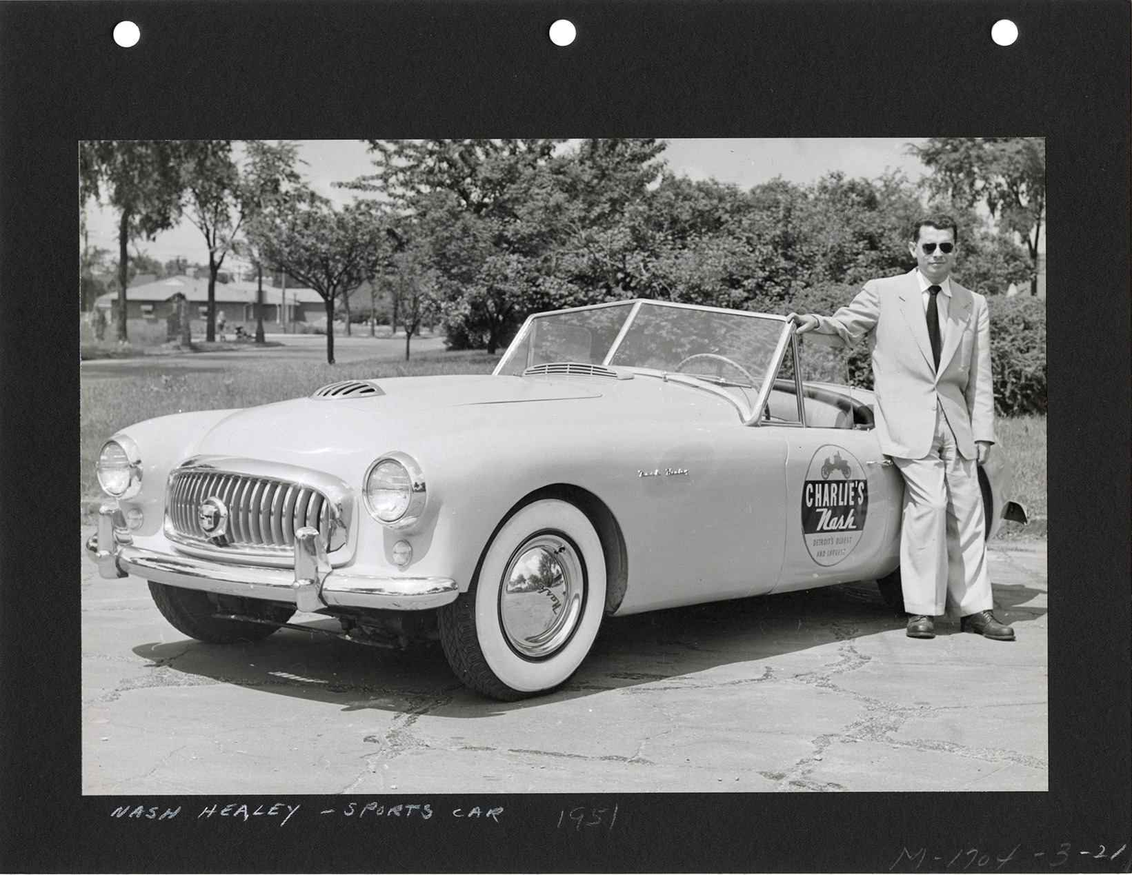 Favorite this☆ Man posing with 1951 Nash-Healey automobile Description: View of a man posing with a 1951 Nash Healey convertible. Logo on side of car reads: "Charlie's Nash, Detroit's oldest and largest." Printed on front: "Nash Healey, sports car, 1951. M-1704-3-21." Details Resource ID: na051421 Subject: Nash automobiles Automobiles, Convertible Photographic prints Date Issued: 1951 Format: 1 photographic print mounted on stock ; image 6.5 x 9.5 in. Member of: National Automotive History Collection Filing Location: Nash-Healey, 1951 Rights: Physical rights are retained by DPL. Copyright is retained in accordance with U.S. copyright laws.