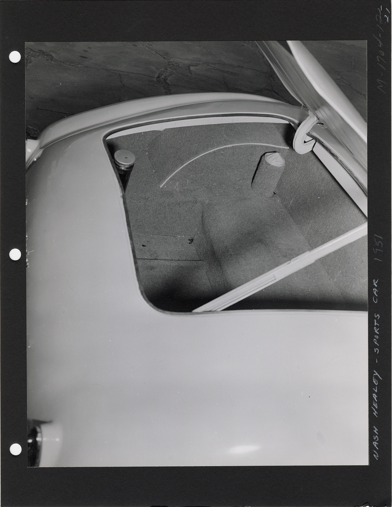 Favorite this☆ Trunk interior, 1951 Nash-Healey automobile Description: Close-up view of the interior of the trunk of 1951 Nash Healey convertible. Printed on front: "Nash Healey, sports car, 1951. M-1704-12-21." Details Resource ID: na051427 Subject: Nash automobiles Automobiles, Convertible Photographic prints Date Issued: 1951 Format: 1 photographic print mounted on stock ; image 7.5 x 9.25 in. Member of: National Automotive History Collection Filing Location: Nash-Healey, 1951 Rights: Physical rights are retained by DPL. Copyright is retained in accordance with U.S. copyright laws.