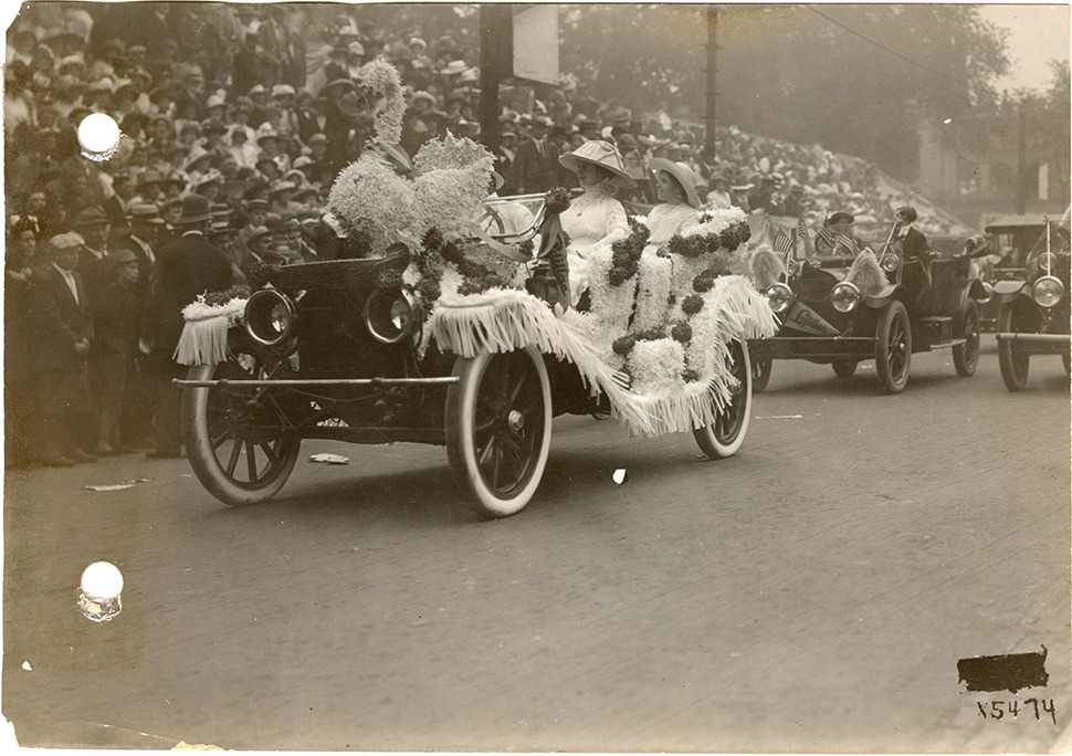 Motorists in decorated automobile, 1912 Cadillaqua parade