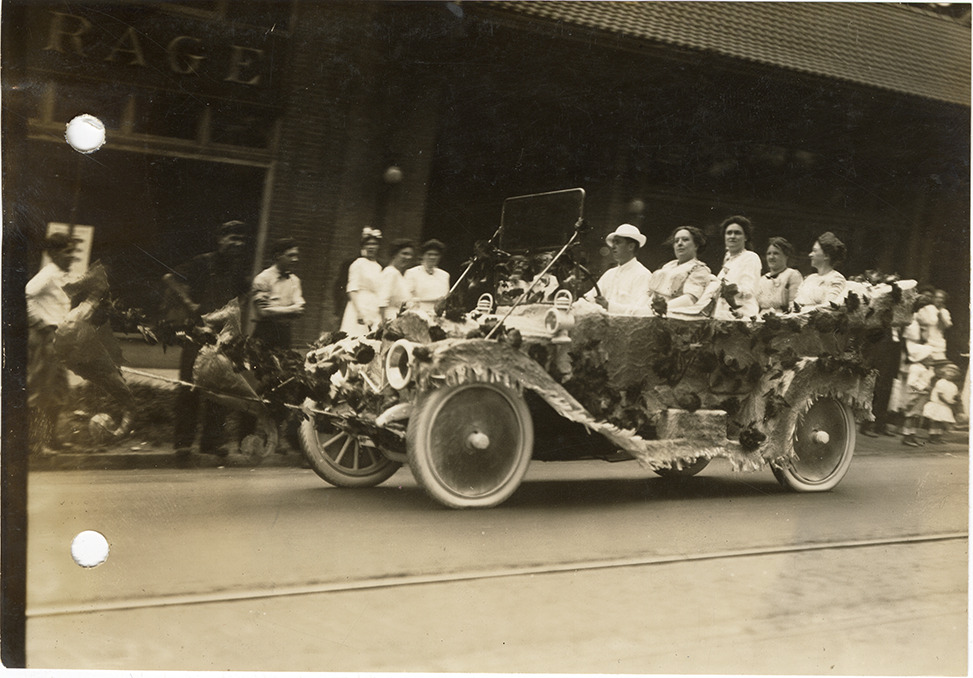View of motorists in a decorated Elmore car during the 1912 Cadillaqua parade. Car is decorated with fringe, flowers and replicas of seahorses. Handwritten on back: "Cadillaqua celebration, Detroit, 1912. Decorated Elmore in parade."