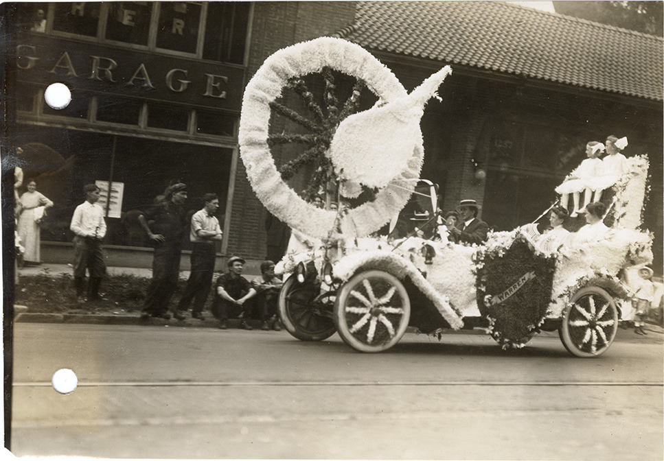 Favorite this☆ Decorated Warren automobile, 1912 Cadillaqua parade Description: View of a decorated Warren car during the 1912 Cadillaqua parade. Car is decorated with a replica of a spinning wheel and a "Warren" shield. Handwritten on back: "Cadillaqua celebration, Detroit, 1912. Warren car beautifully decorated in parade." Details Resource ID: na051462 Subject: Automobiles--Michigan--Detroit Warren Motor Car Company Parades--Michigan--Detroit Detroit (Mich.)--Anniversaries, etc. Photographic prints Date Issued: 1912-07 Format: 1 photographic print ; 4.5 x 6.5 in. Member of: National Automotive History Collection Lazarnick Collection Filing Location: Anniversaries--Cadillaqua, 1912 #7 Rights: Physical rights are retained by DPL. Copyright is retained in accordance with U.S. copyright laws.