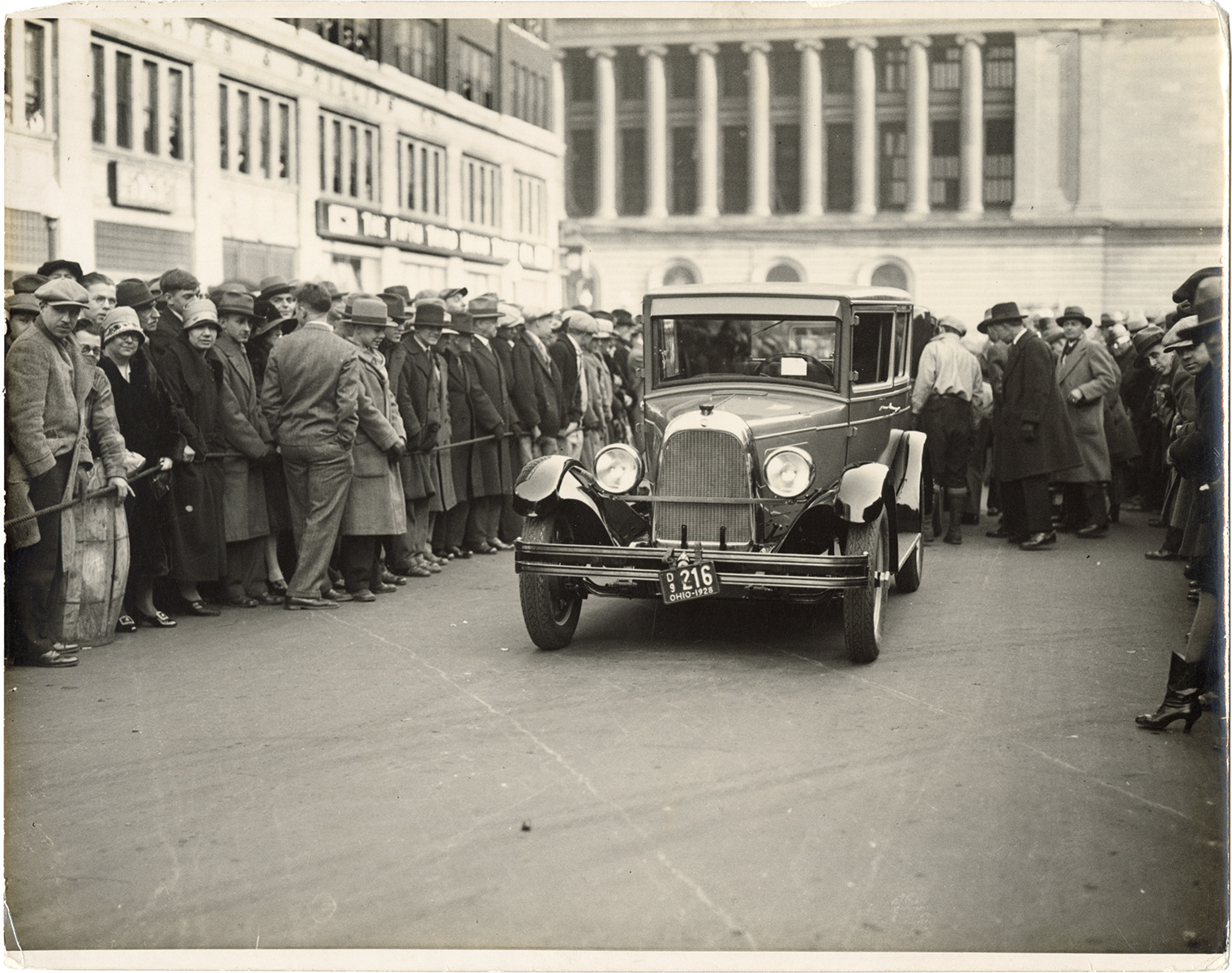 View of a crowd watching a demonstration of a remote-controlled car in Cincinnati, Ohio. Also known as phantom automobiles, the cars were controlled via radio signals from a second vehicle following the driverless car. Car has a 1928 Ohio license plate; buildings in background. Stamped on back: "Photograph from J.R. Schmidt, 3557 St. Charles Place, Hyde Park, Cincinnati, Ohio."