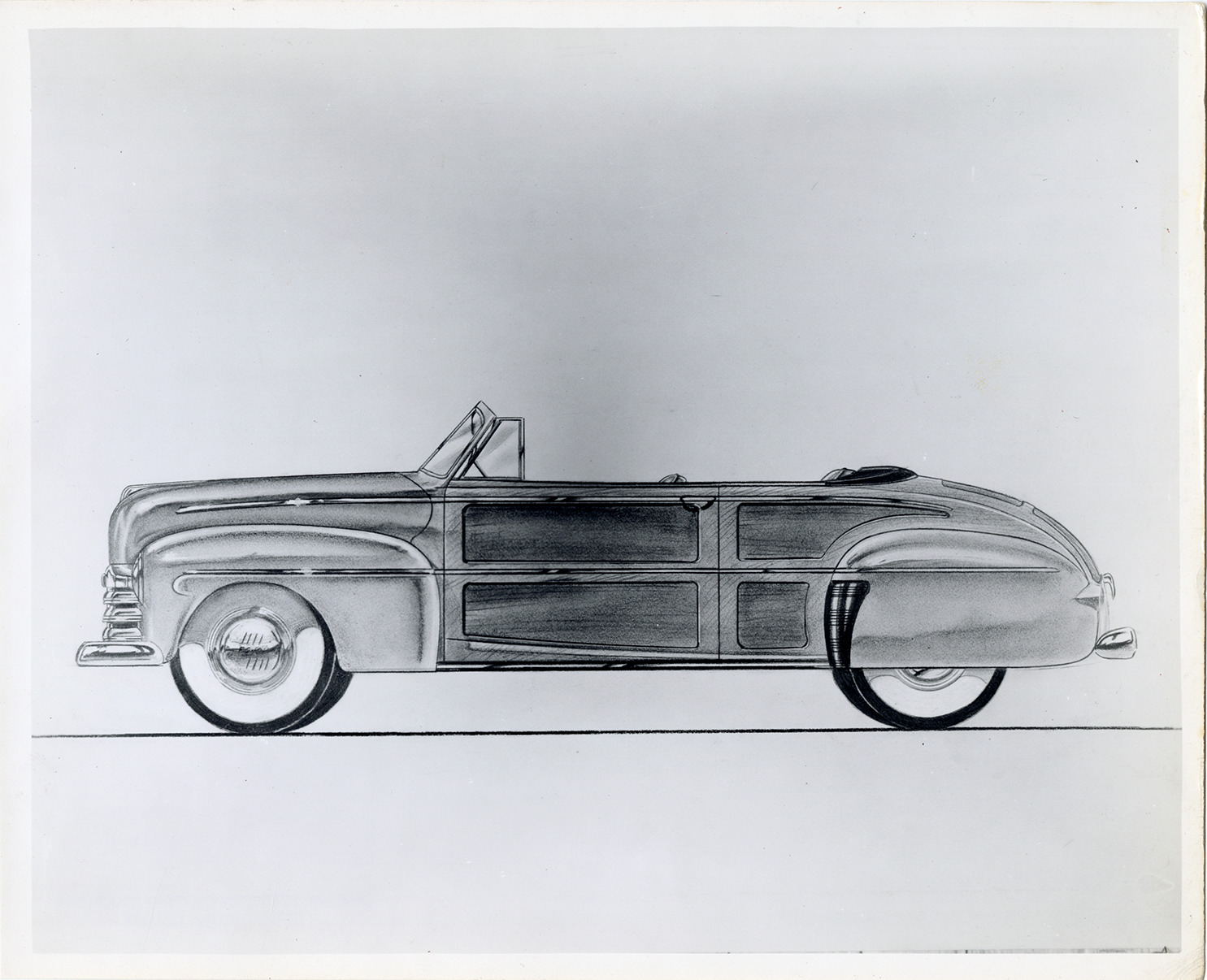 Rendering of a convertible car, designed by John Tjaarda and Associates. Typed on back: "No.: MS6/33 - folder 7. Subject: Automobiles--Design and construction (John Tjaarda and Associates, John Tjaarda). Collection: MS6/ John Tjaarda Collection. Date: 1942. Location: [blank]. Photographer: [blank]. Source: [blank]. I.D.: [blank]."