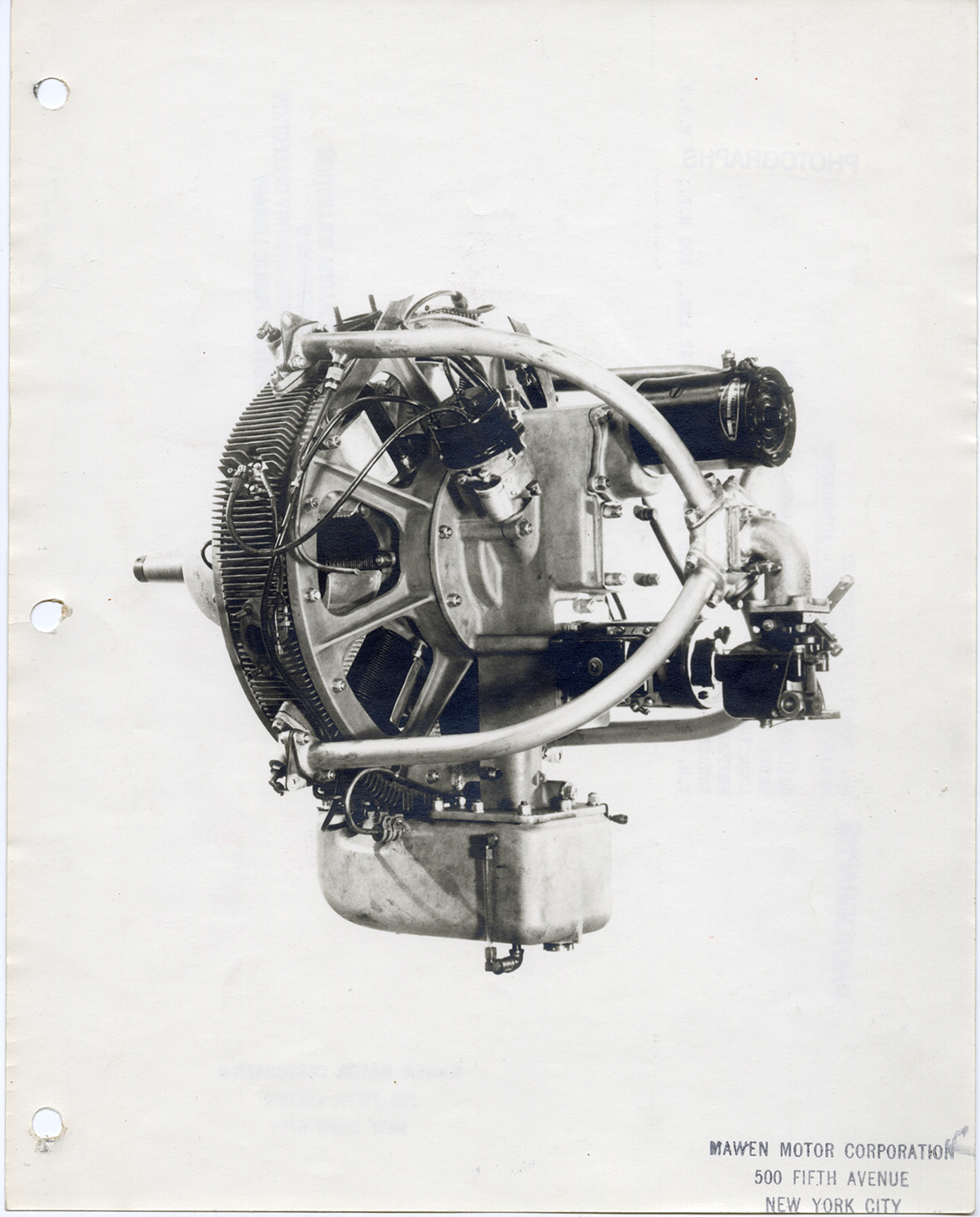 View of an air-cooled engine, designed by John Tjaarda. Stamped on front: "Mawen Motor Corporation, 500 Fifth Avenue, New York City." Stamped on back: "Mawen Motor Corporation, 500 Fifth Avenue, New York City." Typed on back: "No.: MS6/112 - folder 22. Subject: Engines--Automotive. Collection: MS6/ John Tjaarda Collection. Date: c.1935. Location: [blank]. Photographer: [blank]. Source: [blank]. I.D.: Air-cooled engine. Weight: 42 lbs., 100 h.p., 79 m.p.g."