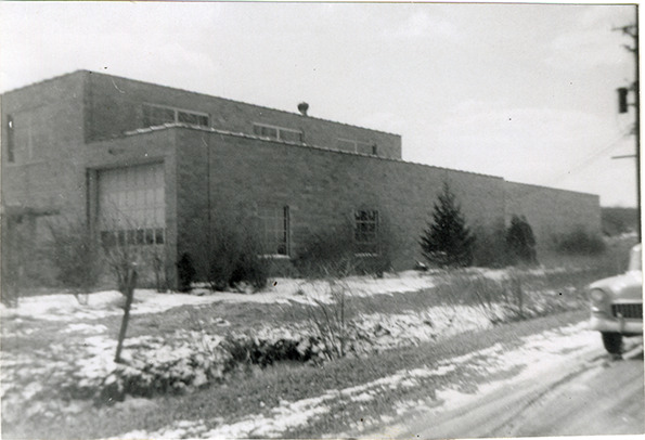 View of brick factory building used for manufacturing simulated automobile wood body panels designed by John Tjaarda and Associates. Handwritten on back: "No.: MS6/129 - folder 29. Subject: Factories--Plant for simulated automobile wood body panels. Collection: MS6/ John Tjaarda Collection. Date: c.1955. Location: [blank]. Photographer: [blank]. Source: [blank]. I.D.: [blank]."