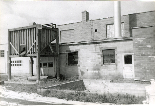 View of brick factory building used for manufacturing simulated automobile wood body panels designed by John Tjaarda and Associates. Handwritten on back: "No.: MS6/132 - folder 29. Subject: Factories--Plant for simulated automobile wood body panels. Collection: MS6/ John Tjaarda Collection. Date: c.1955. Location: [blank]. Photographer: [blank]. Source: [blank]. I.D.: [blank]."