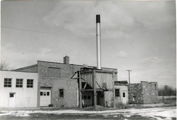 View of brick factory building used for manufacturing simulated automobile wood body panels designed by John Tjaarda and Associates. Metal smokestack. Handwritten on back: "No.: MS6/132 - folder 29. Subject: Factories--Plant for simulated automobile wood body panels. Collection: MS6/ John Tjaarda Collection. Date: c.1955. Location: [blank]. Photographer: [blank]. Source: [blank]. I.D.: [blank]."