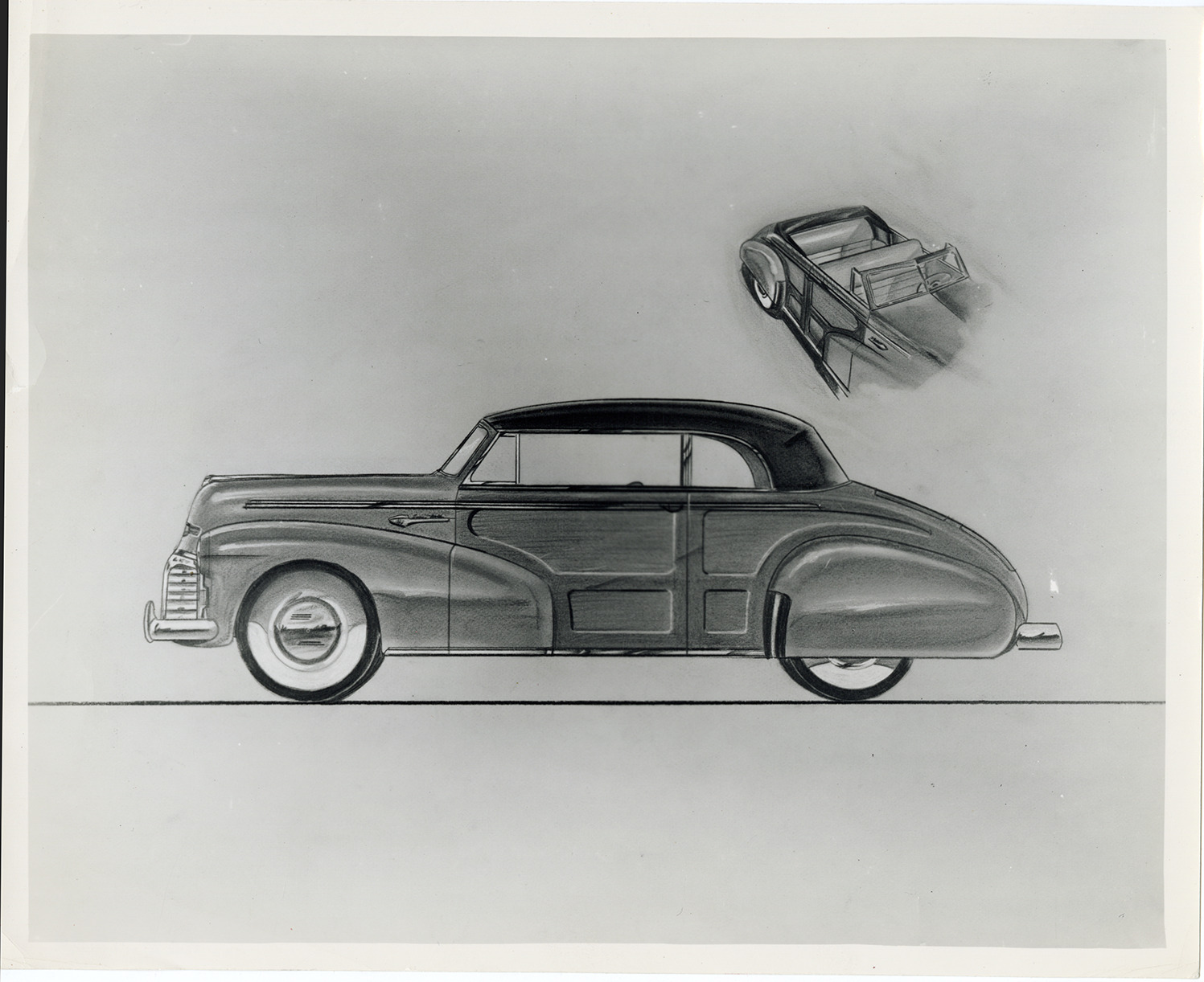 Rendering of a car, designed by John Tjaarda and Associates. Typed on back: "No.: MS6/31 - folder 7. Subject: Automobiles--Design and construction (John Tjaarda and Associates, John Tjaarda). Collection: MS6/ John Tjaarda Collection. Date: c.1942. Location: [blank]. Photographer: [blank]. Source: [blank]. I.D.: [blank]."