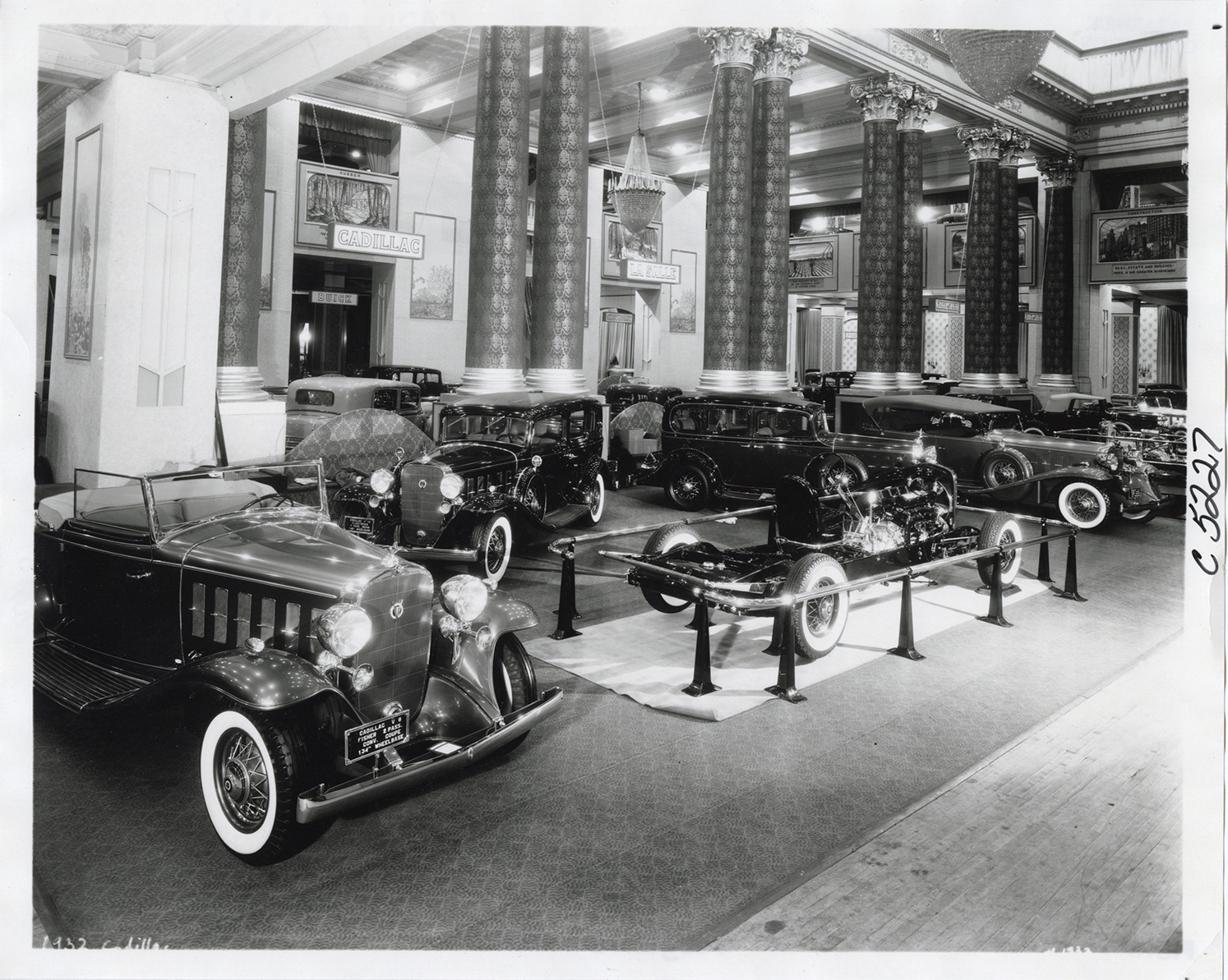 View of 1932 Cadillac cars and chassis on display at trade show. "Cadillac" and "LaSalle" signs displayed in background. Handwritten on back: "Cadillac, 1932."