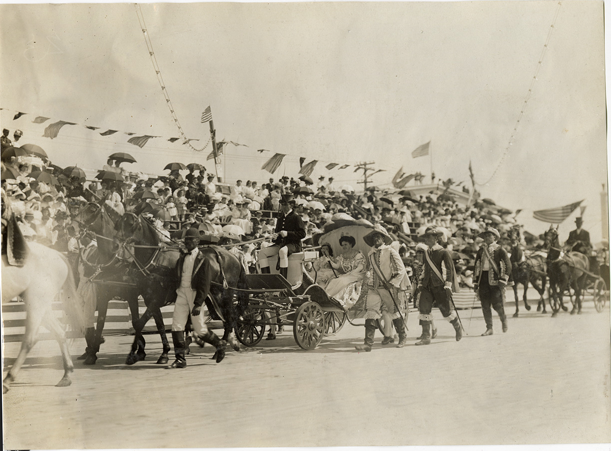 View of carnival queen riding in horse-drawn coach, flanked by attendants, during parade at the 1907 Asbury Park Baby Carnival. Crowd watches from grandstand in background. Stamped on back: "Spooner and Wells, 1931 Broadway, New York, duplicates any time, enlargements all sizes, tel. 3472-3473 Col., credit appreciated."