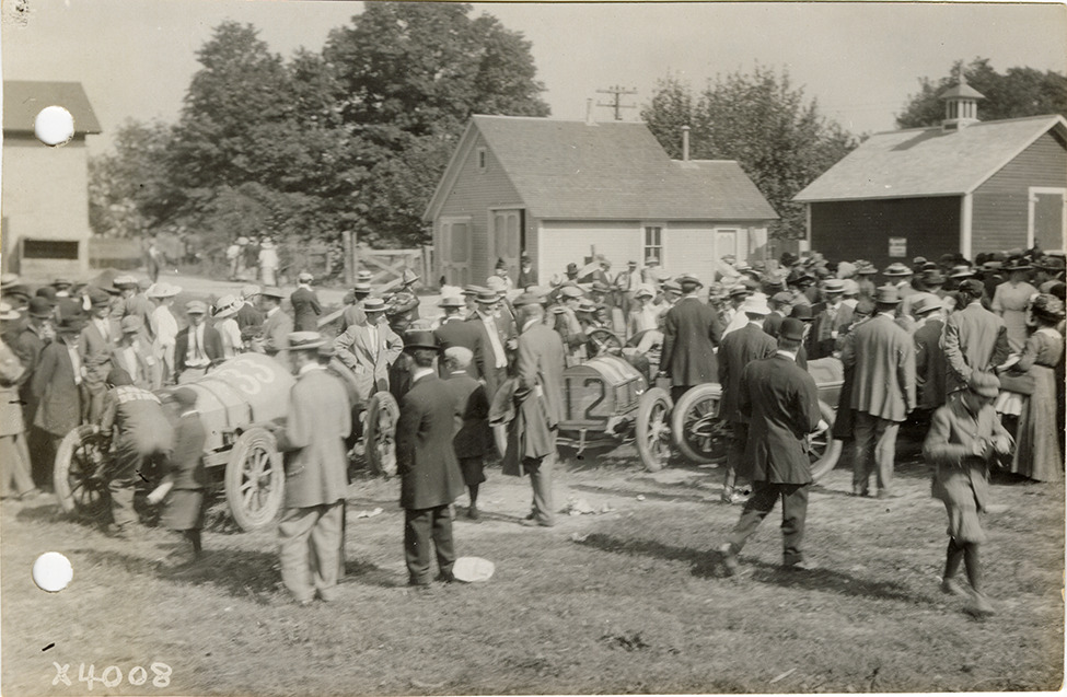 View of crowd surrounding Abbott-Detroit car no. 33, Mercer car no. 15 and car no. 12 on scales after race during the 1911 Elgin National Stock Chassis races in Illinois. Wooden-frame buildings in background. Stamped on back: "Spooner & Wells, Inc., photographers, 1231 Woodward Ave., Detroit, Mich., telephone North 1745." Handwritten on back: "Crowd around Abbott #33 and Mercer #15 at scales after race."