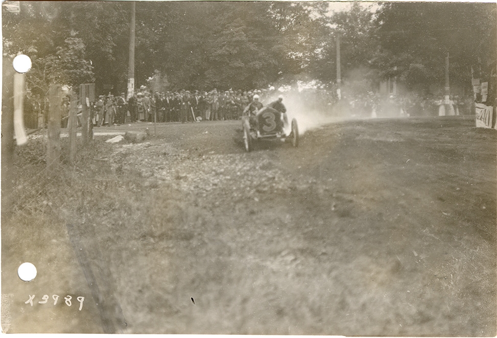 View of Charles Merz and passenger driving National car no. 3 past spectators during the 1911 Elgin National Stock Chassis races in Illinois. Stamped on back: "Spooner & Wells, Inc., photographers, 1231 Woodward Ave., Detroit, Mich., telephone North 1745." Handwritten on back: "Merz, National #3."