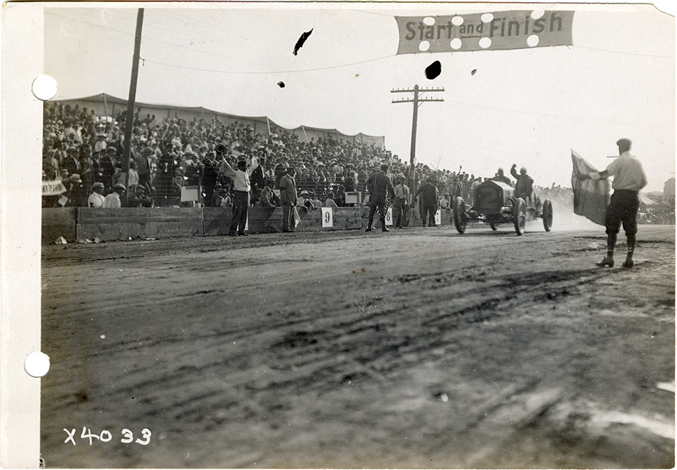 View of Len Zengle in National car no. 2 during the 1911 Elgin National Stock Chassis races in Illinois. "Start and finish" banner is suspended over track. Crowd in grandstand. Stamped on back: "Spooner & Wells, Inc., photographers, telephones 3472-3473 Columbus, 1931 Broadway, New York." Handwritten on back: "Len Zengel [sic] National #2 winning Elgin race. Harry Grant, Alco #1, second Elgin race."