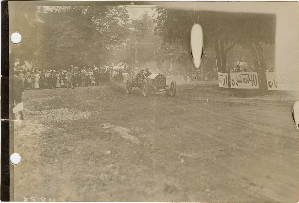 M.J. Armstrong in Colby racecar rounding Hornbeck Turn, 1911 Elgin National Stock Chassis races
