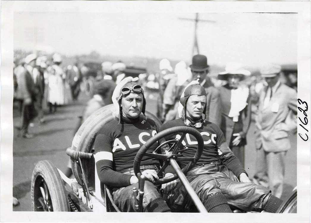 Harry Grant and passenger posing in Alco racecar, 1911 Elgin National Stock Chassis races