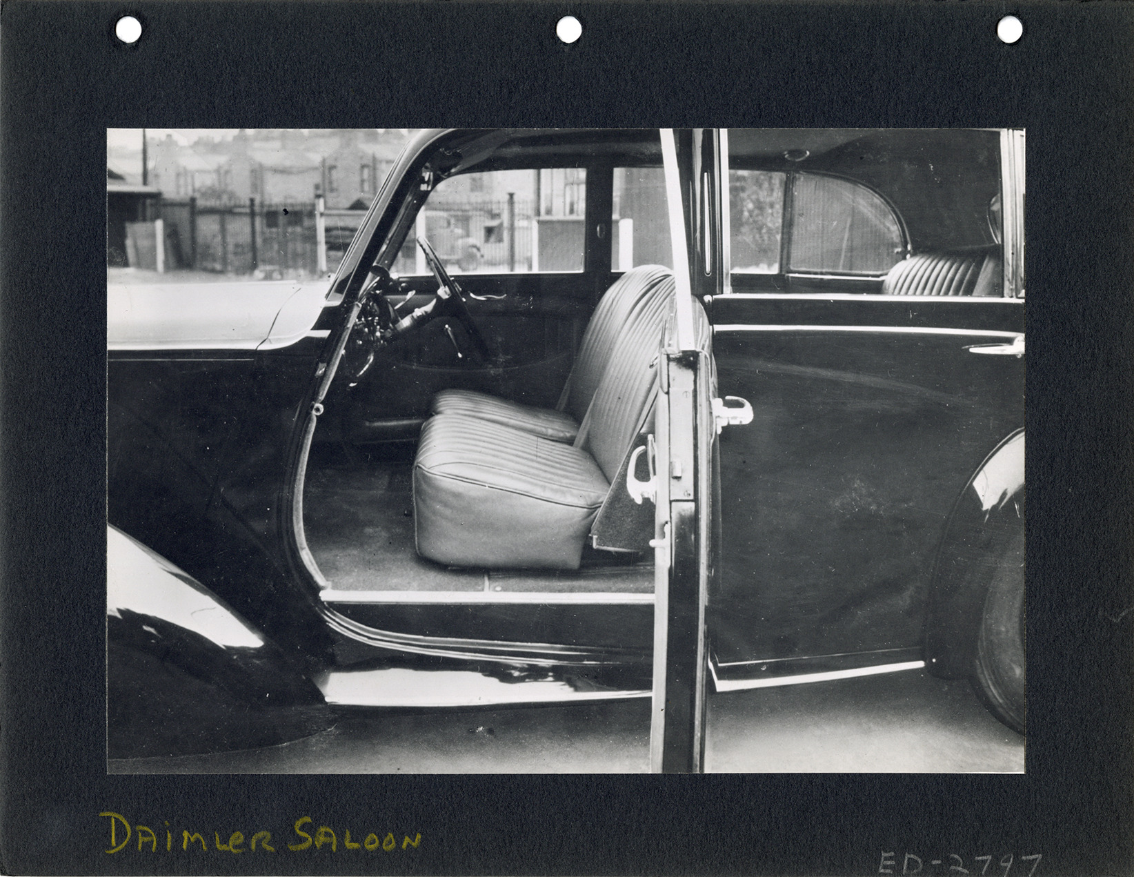Favorite this☆ Interior, Daimler Saloon automobile Description: View of the interior of a Daimler Saloon car, showing front seat. Handwritten on front: "Daimler Saloon." Handwritten on back: "5/49." Details Resource ID: na051662 Subject: Daimler automobile Automobiles--Interiors Automobiles--Seats Photographic prints Date Issued: 1949-05 Format: 1 photographic print mounted on stock ; image 6.25 x 9 in. Member of: National Automotive History Collection Filing Location: Daimler Rights: Physical rights are retained by DPL. Copyright is retained in accordance with U.S. copyright laws.