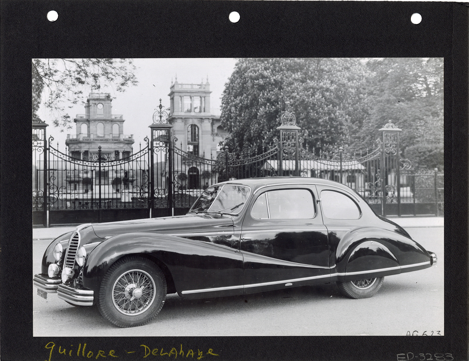 View of a Delahaye car, with body by the coachbuilder Alphonse Guillore. Handwritten on front: "Guillore, Delahaye." Handwritten on back: "4/50."
