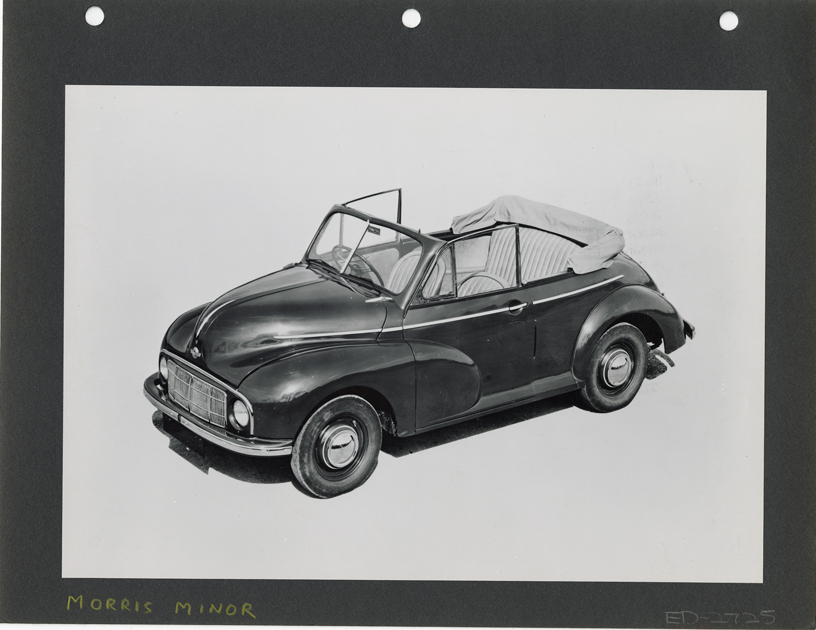 View of a Morris Minor convertible. Handwritten on front: "Morris Minor."