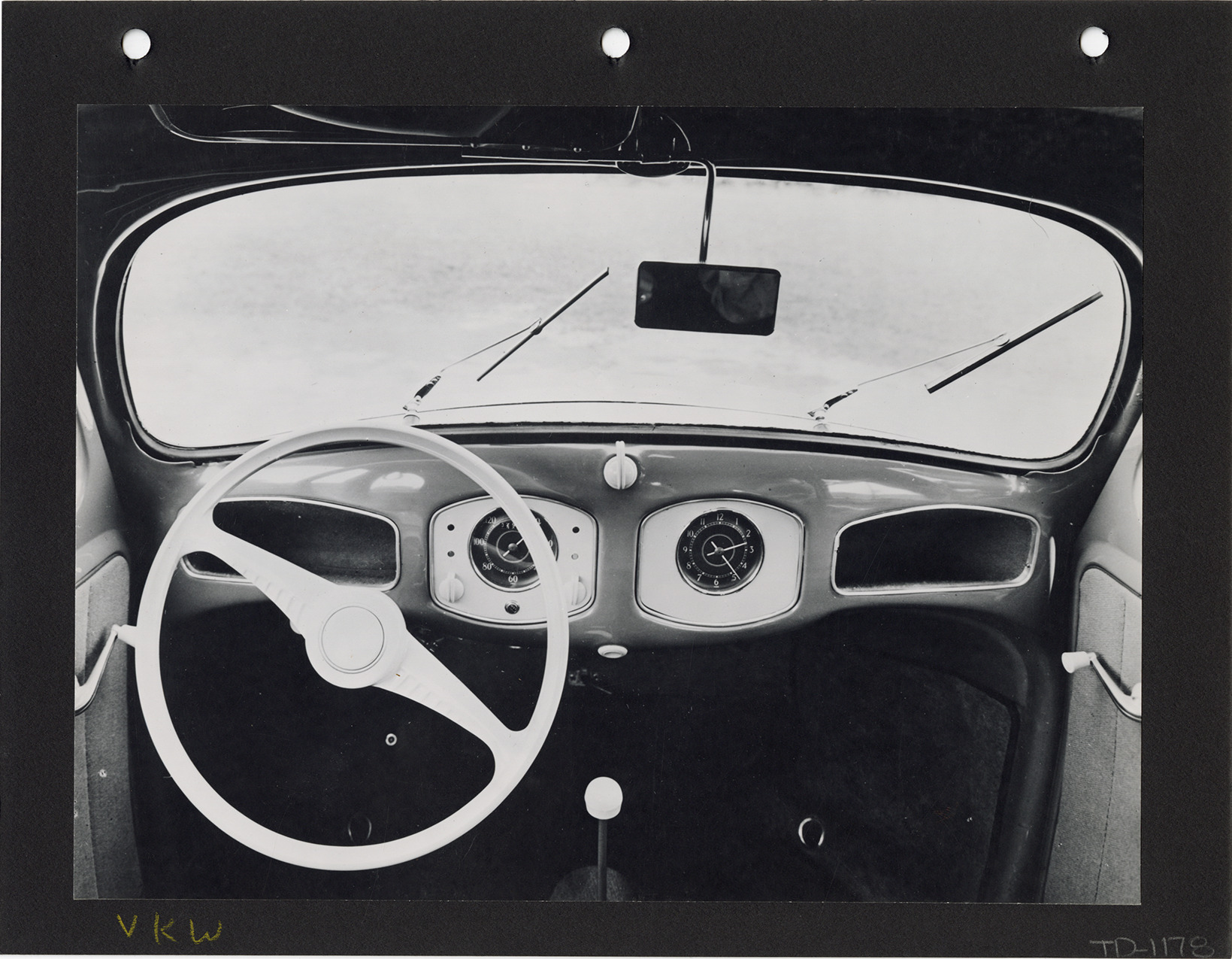 Favorite this☆ Interior, Volkswagen Beetle automobile Description: Interior view of a Volkswagen Beetle car, showing windshield, steering wheel and instrument panel. Handwritten on front: "VKW." Handwritten on back: "9/49." Details Resource ID: na051712 Subject: Volkswagen Beetle automobile Automobiles--Interiors Automobiles--Windows and windshields Automobiles--Steering-gear Automobiles--Instrument panels Photographic prints Date Issued: 1949-09 Format: 1 photographic print mounted on stock ; image 7 x 9.5 in. Member of: National Automotive History Collection Filing Location: Volkswagen Rights: Physical rights are retained by DPL. Copyright is retained in accordance with U.S. copyright laws.