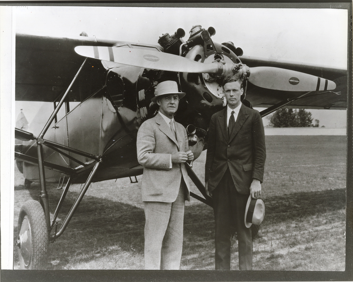 Alvan Macauley and Charles Lindbergh posing with Packard airplane at Selfridge Field