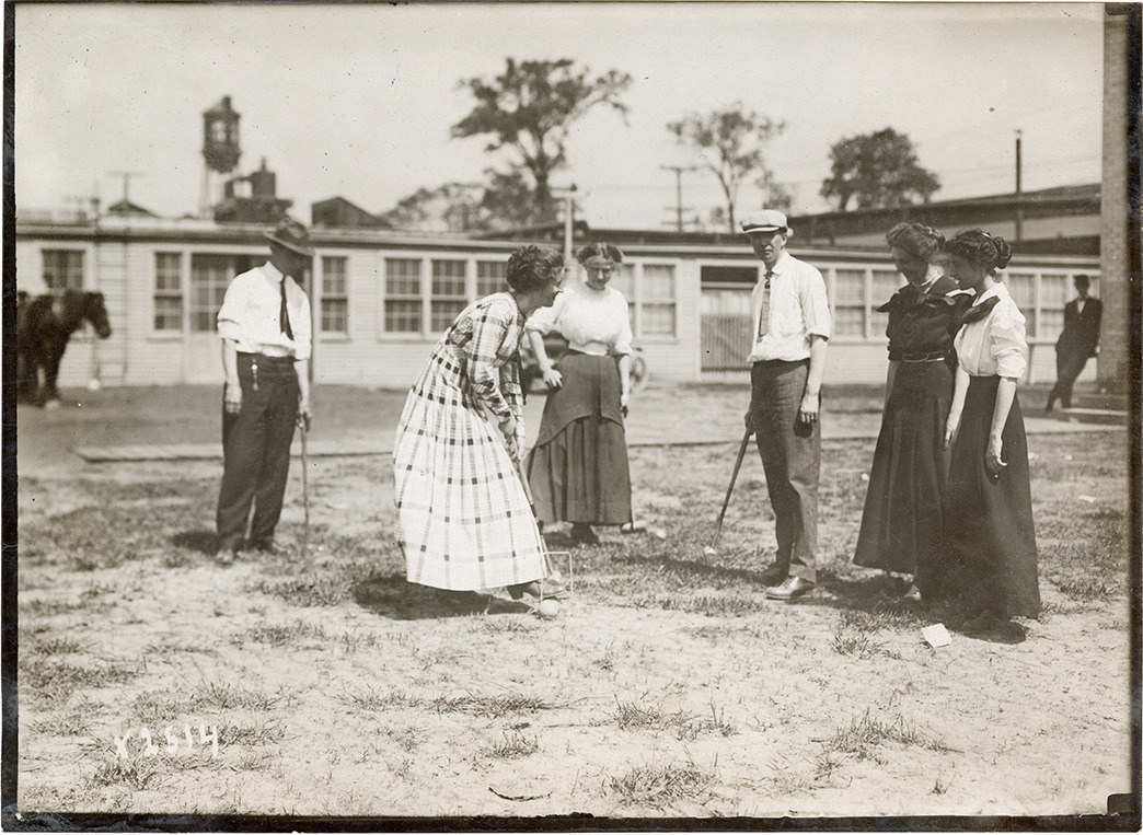 View of men and women playing croquet in front of the Brush Runabout Company factory. In 1911, the company installed tennis courts and croquet grounds for its employees. Most of the practicing was done during the noon hour and after the workday. Handwritten on back: "Tennis, Brush factory, 1911."