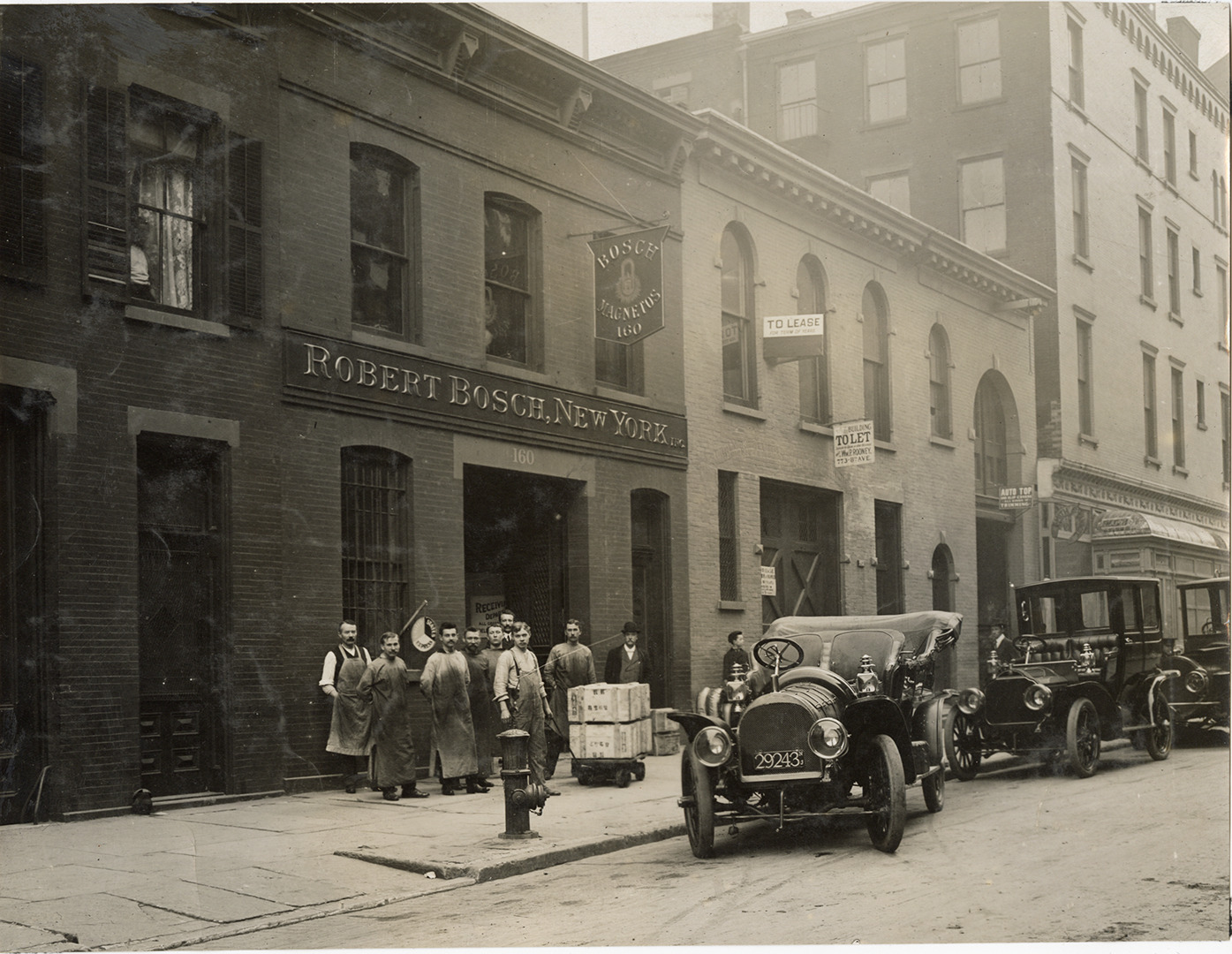 View of employees posing in front of the Robert Bosch company building, manufacturer of Bosch magnetos. Business was located at 160 West 56th Street, New York. Crates on sidewalk; cars parked along curb. Signs on building read: "Robert Bosch, New York, Inc." and "Bosch magnetos, 160."