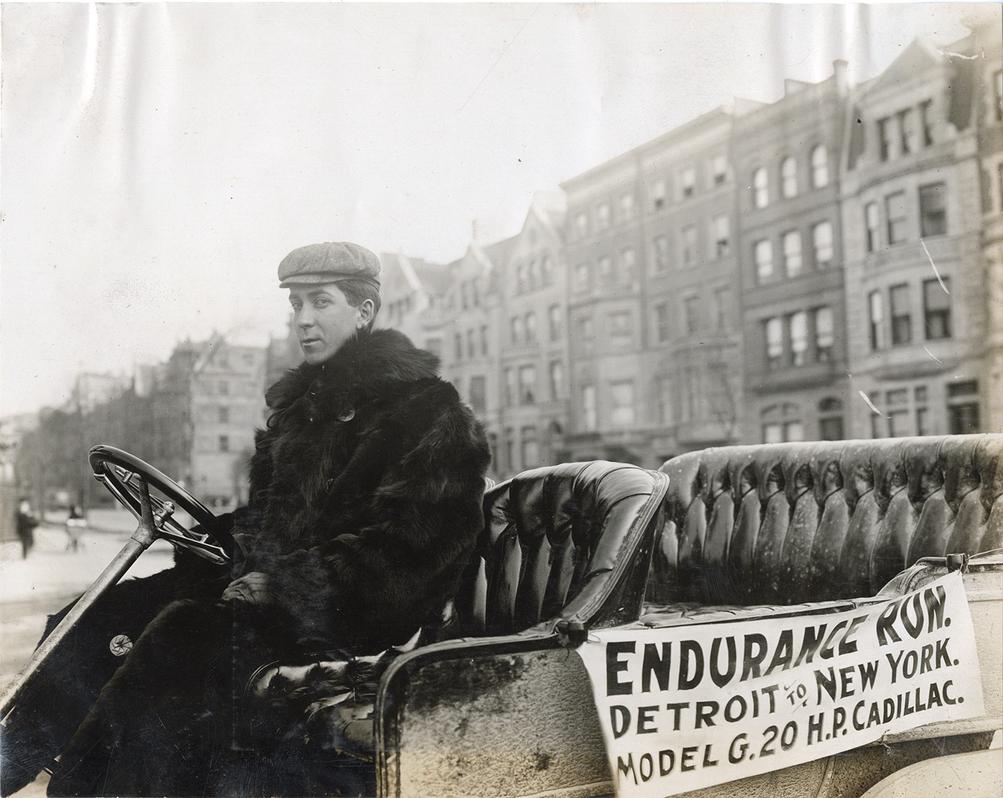 Motorist posing in 1907 Cadillac Model G automobile, Detroit to New York Endurance Run