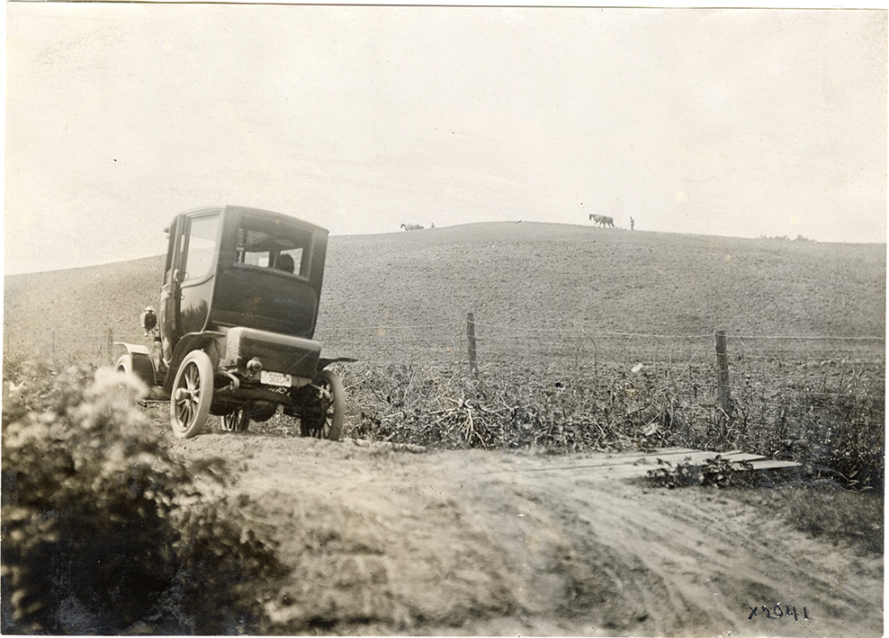 Rear view of a 1911 Detroit Electric car on a rural dirt road. Man plows agricultural field in background. Stamped on back: "Spooner & Wells, Inc., photographers, telephone North 1745. 1231 Woodward Ave., Detroit, Mich. Detroit, 1231 Woodward, New York, 1931 Broadway." Handwritten on back: "Det. Elec. 1911."