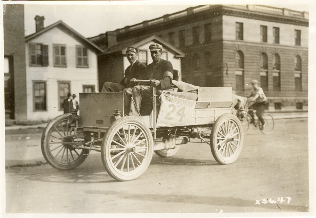 View of driver and passenger posing in Lincoln truck no. 24 during the 1911 Commercial Vehicle Reliability Run sponsored by the Chicago Evening American. Sign on side of truck: "24, Chicago Evening American, Commercial Vehicle Reliability Run." Commercial buildings, houses and bicyclist in background. Stamped on back: "Spooner & Wells, Inc., photographers, 1231 Woodward Ave., Detroit, Mich., telephone North 1745." Handwritten on back: "Motor trucks--Lincoln, ca. 1911."