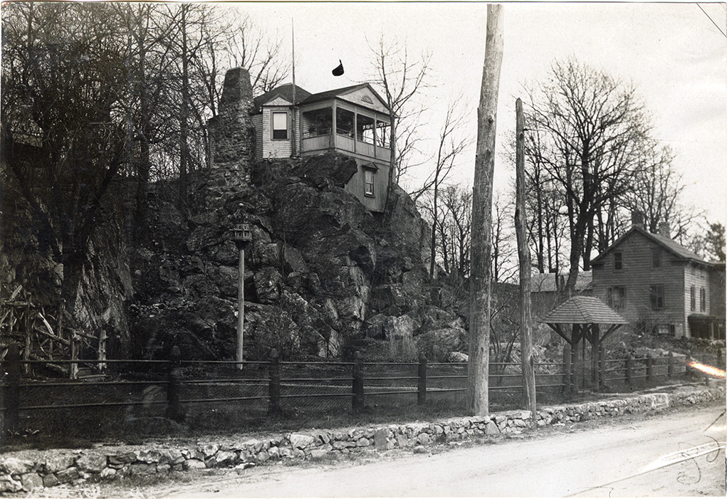 View of "The Ledge," a two-story, wooden-frame house with covered porch built on bedrock above street level. Stone chimney on side of house; wooden-frame house on right. Covered gate in foreground; birdhouse in background. Handwritten on back: "The Ledge, Ledgewood, N.J."
