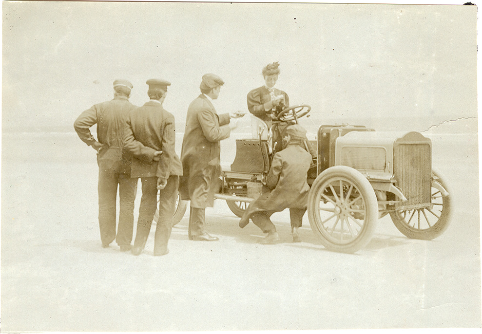 View of Joan Cuneo in White Steamer during automobile race on beach at Atlantic City, New Jersey. Four men stand next to car. Stamped on back: "Photo by F. Ed. Spooner, 1536 B'way, telephone 6536-38th St., New York, N.Y." Handwritten on back: "Mrs. Cuneo."