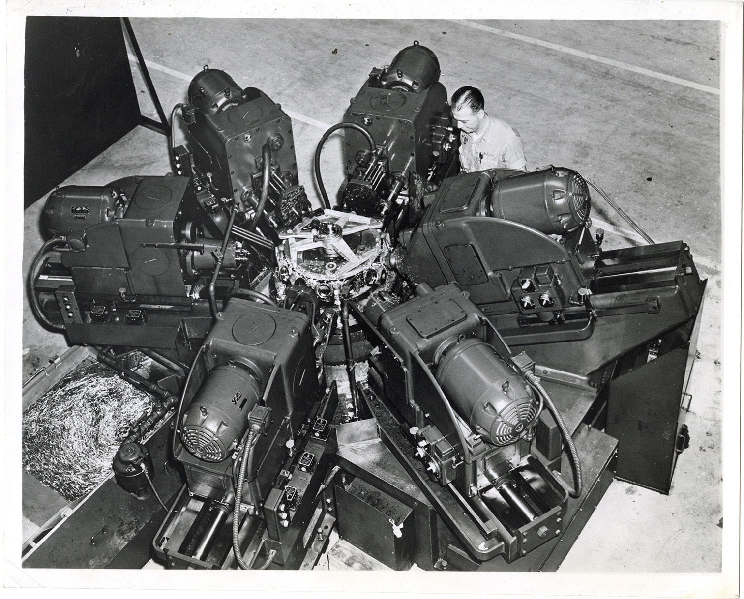 View of worker with boring and facing machine at the Wright Aeronautical Corporation in Cincinnati, Ohio. Label on back: "Please credit Wright Aeronautical Corp. One of 2100 new machine tools in the huge new Cincinnati plant of the Wright Aeronautical Corp. An ingenious 19-ton wizard, this one machine performs 45 boring and facing operations that formerly required 8 machines and does the work in 24 minutes instead of almost 4 hours. The part being produced is a supercharger housing." Handwritten on back: "ACWP - Machine tools."