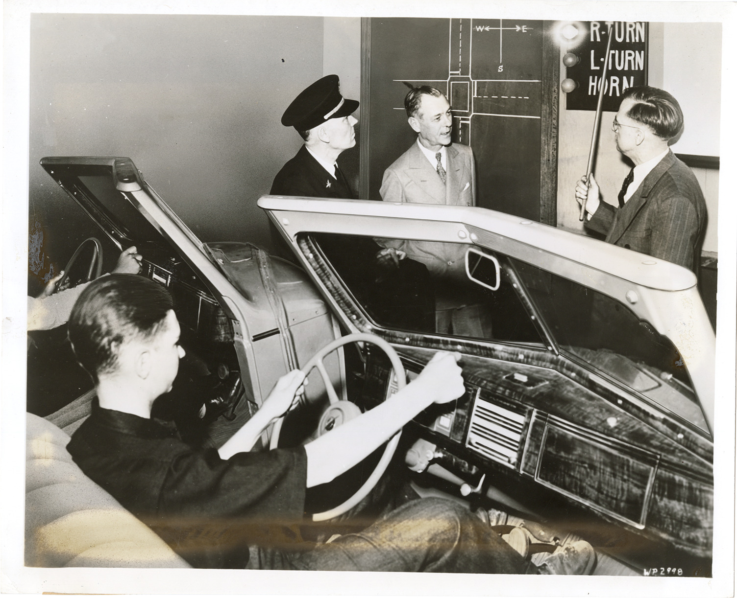 View of students in driving simulators at Highland Park High School. Label on back: "Michigan school to train expert drivers. Vincent J. Hofman (right), instructor of Highland Park High School's unusual driving course, demonstrates the electric 'tell-tale' that shows how student drivers respond to traffic situations flashed on a movie screen. D.S. Eddins (center), president of Plymouth Motor Corp., and Police Chief Dan E.L. Patch witnessed the first trial session with the school's realistic training 'cars,' which were built by Plymouth to this special design created by Highland Park educators and traffic experts. The new driving class will open as a regular part of the high school curriculum this fall. From: Press Bureau, J. Stirling Getchell, Inc. New Center Bldg., Detroit."