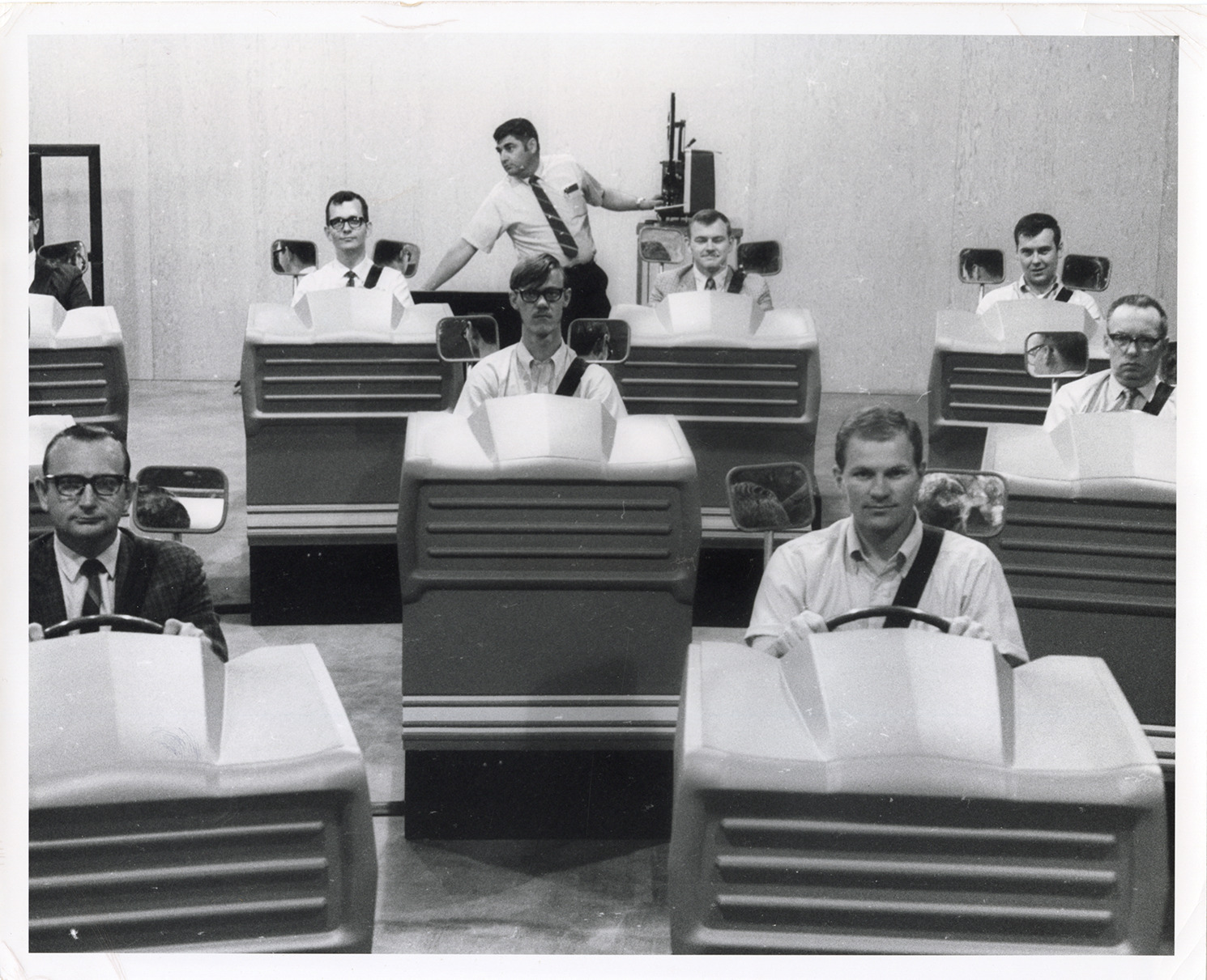 View of several graduate students posing in driver simulation equipment at Central Missouri State College. Label on back: "For immediate release. Driver simulation equipment. a basic element of the driver education facility at Central Missouri State College is this 12-place classroom driver simulation equipment. Shown above is a group of graduate students at the College who are learning how to use the driver simulation equipment as a teaching tool. The simulators permit students to have a wide variety of driving experiences such as urban traffic, expressways, and residential areas, prior to driving practice on a large multiple-car driving range located just South of the main campus. Photo release, 10/13/69."