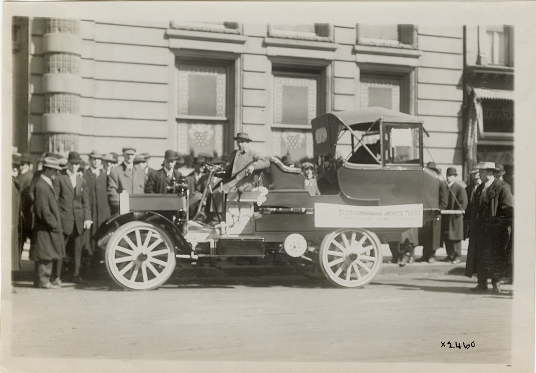 View of onlookers and driver posing with a Brunn & Co. five-passenger sheltered phaeton in front of the Hotel Pontchartrain. Banner on car reads: "Grant Bros., Federal trucks. Brunn combination sheltered phaeton. W.T. Cullen, 200 Majestic Bldg., Western sales agent."