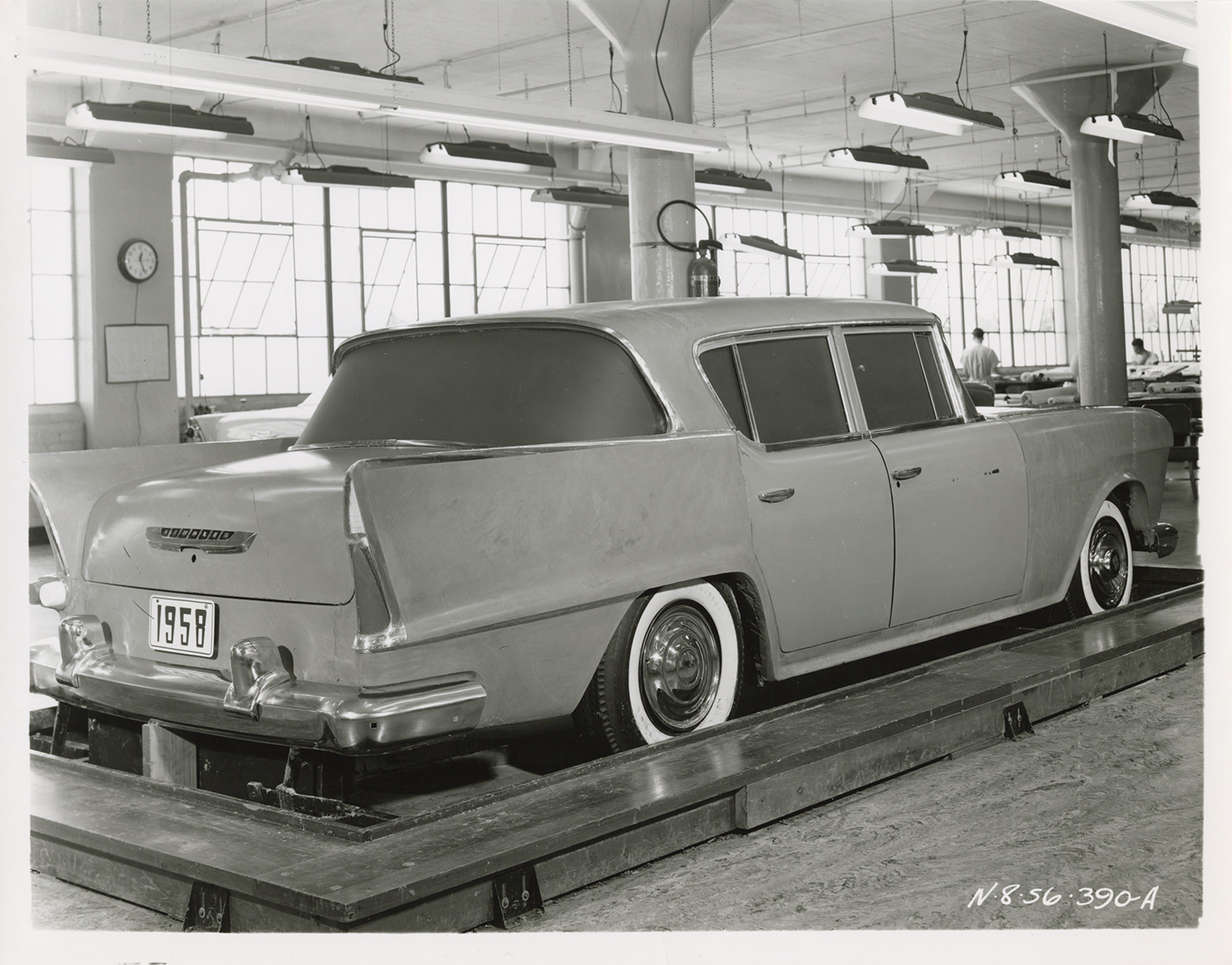 Rear view of a 1958 Hudson experimental car. Handwritten on back: "1958 Hudson experimental."