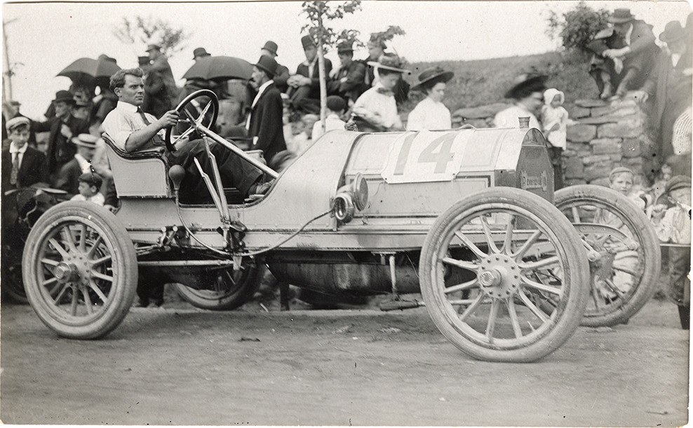 Driver posing in 1908 Pennsylvania racecar