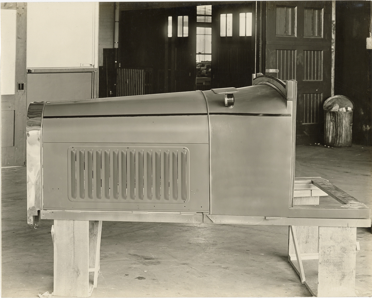 View of front end of the body of a 1926 Hudson Super Six car. Stamped on back: "Jeffery White Studio Inc., 243 West Congress St., Detroit, Mich. Commercial photo specialists." Handwritten on back: "Oct. 11/26. Straight left side view Hudson body front."
