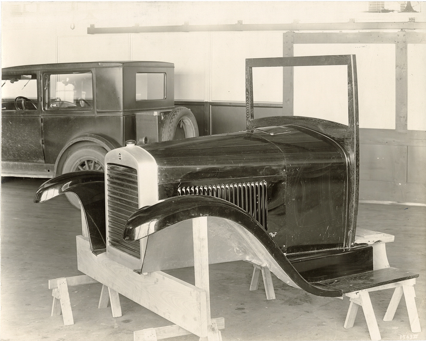 View of front end of the body of a 1926 Essex car. Second car in background. Stamped on back: "Jeffery White Studio Inc., 243 West Congress St., Detroit, Mich. Commercial photo specialists." Handwritten on back: "Oct. 11/26. 3/4 left front view Essex body front."
